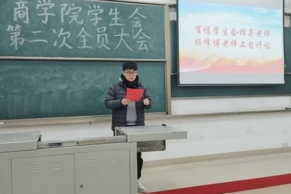为总结本学期的工作内容,为这一学期的工作划上圆满的句号,同时加强各部门间的联系,让学生会大家庭更团结友爱。商学院学生会于2023年12月15日在教学楼2-101开展商学院学生会第二次全员大会。出席本次全员大会的嘉宾和老师有:商学院学生会指导老师杨峰博及商学院学生会全体人员。