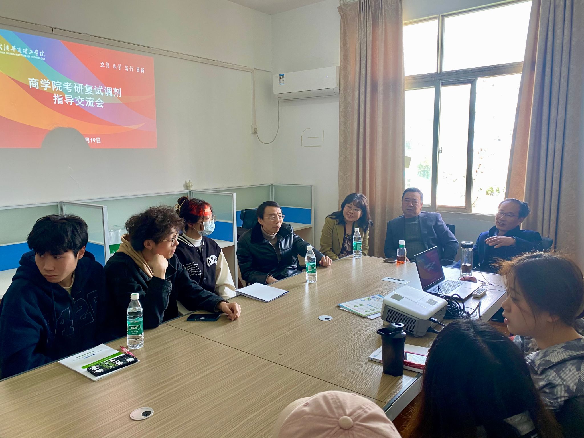 为进一步做好2024届毕业生考研复试服务工作,帮助2024届考研学子掌握考研复试相关技能,提高考研复试成功率。2024年3月19日上午,商学院在一站式学生社区举行了2024年考研复试调剂指导交流会。本次交流会邀请了武汉理工大学管理学院教授、博士生导师、武汉华夏理工学院学术委员会主任、商学院院长程艳霞,武汉理工大学管理学院教授、博士生导师、留澳学者、武汉华夏理工学院商学院互联网专业集群责任教授王虎,武汉理工大学管理学院教授、博士生导师、武汉华夏理工学院商学院财经类专业集群责任教授胡华夏,武汉理工大学经济学院教授、博士生导师、武汉华夏理工学院商学院经济学科带头人朱金生到会指导。商学院学生工作办公室主任潘晶主持,2024届考研过初试线学生以及商学院组织员刘浩波、大三大四年级辅导员参加交流会。