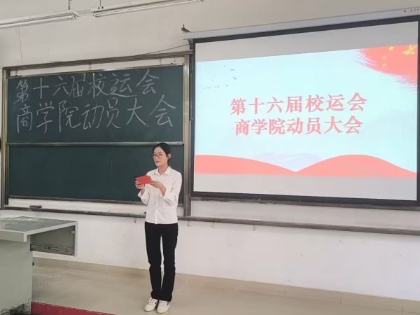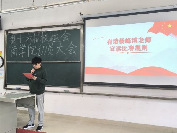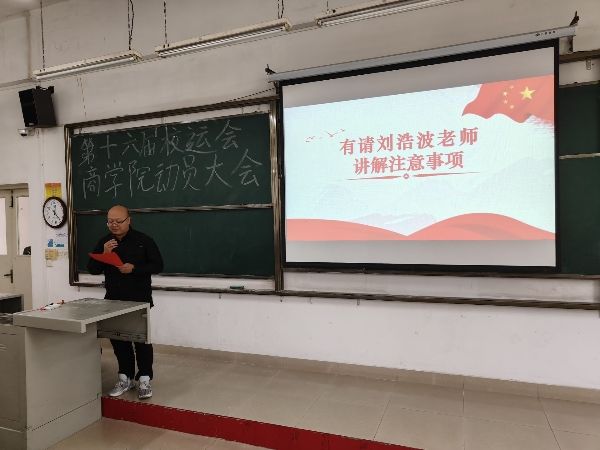 为了更好的迎接校运会的到来,调动运动员们对比赛的积极性,商学院学生会于2024年4月12日中午12:20在教学楼1-101进行第十六届校运会商学院动员大会,莅临此次大会的嘉宾和老师有商学院党总支组织员刘浩波、商学院学工办主任潘晶、商学院团总支书记何啟、商学院团总支副书记龙宇豪、杨峰博、各年级辅导员以及学生会主要负责人。