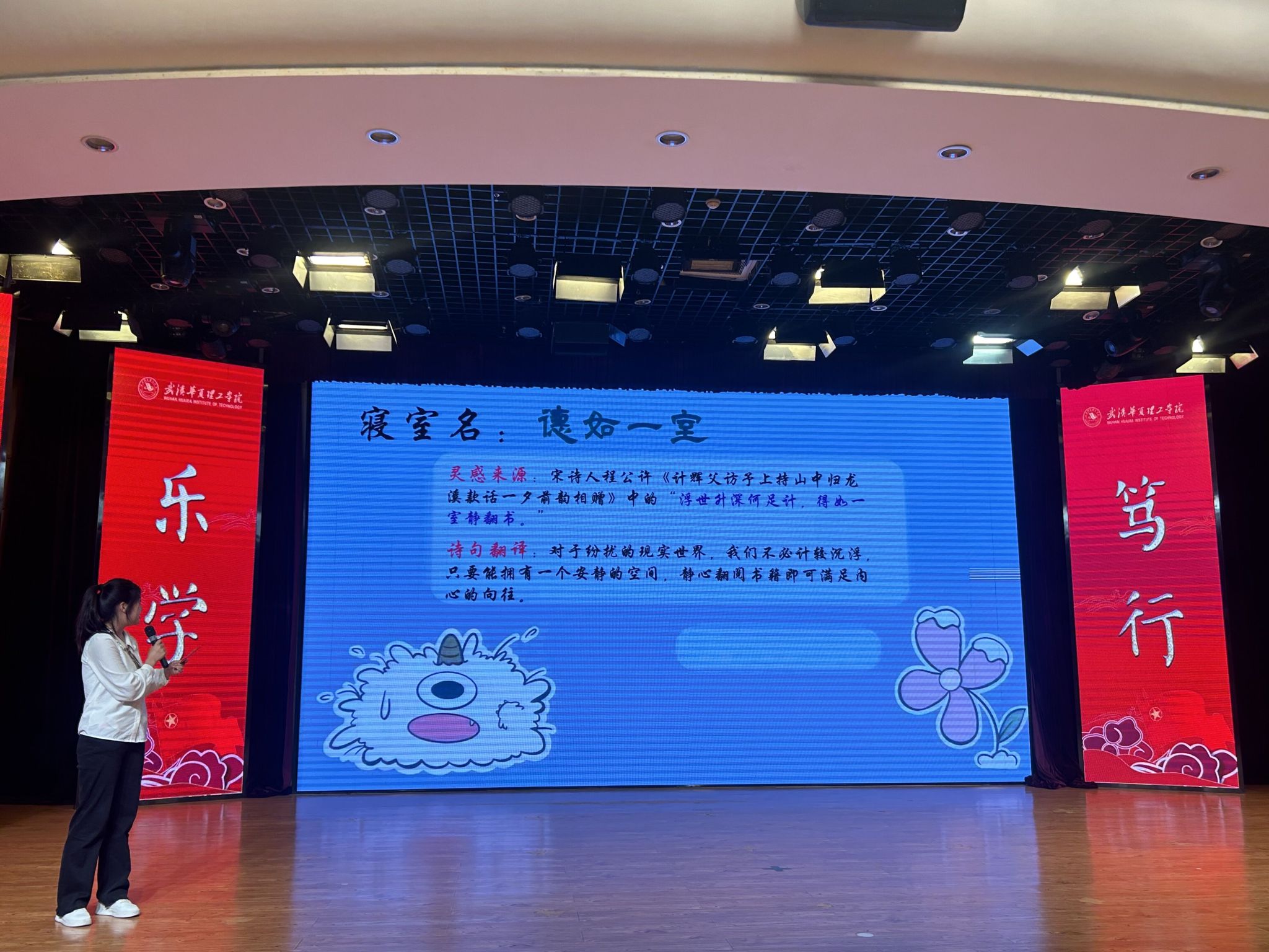 活动伊始,由商学院学生会舞蹈队带来舞蹈点燃全场,观众们的视线聚焦于舞台,现场气氛活跃。随后,决赛答辩正式开始,各寝室代表解说员依次讲解寝室的布置设计理念。他们举止从容,从寝室名称、寝室成员、才艺展示等多层次多方面讲述了来自五湖四海的同学们聚集在一起的青春故事,展示了当代大学生积极向上、活力四射的精神风貌。他们以独特的视角和创意,将独属于寝室的温暖和快乐展现地淋漓尽致。