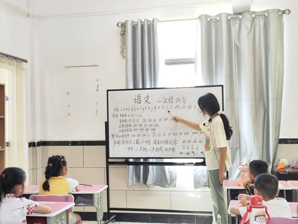 缤纷课堂,实践队成员程芷柔和孩子们一起呈现了一节趣味语文课。课堂上,程老师循循善诱使用启发式教学,和孩子们一起朗读汉字声母韵母,拼写汉字拼音并进行听写。孩子们沉浸其中,积极回答问题,踊跃举手朗读背诵,乐于思考问题,共同感受汉字拼音的魅力。在教学过程中,孩子们不断巩固自己的知识,提高了对语文的学习兴趣,形成了活络的语文学习氛围。