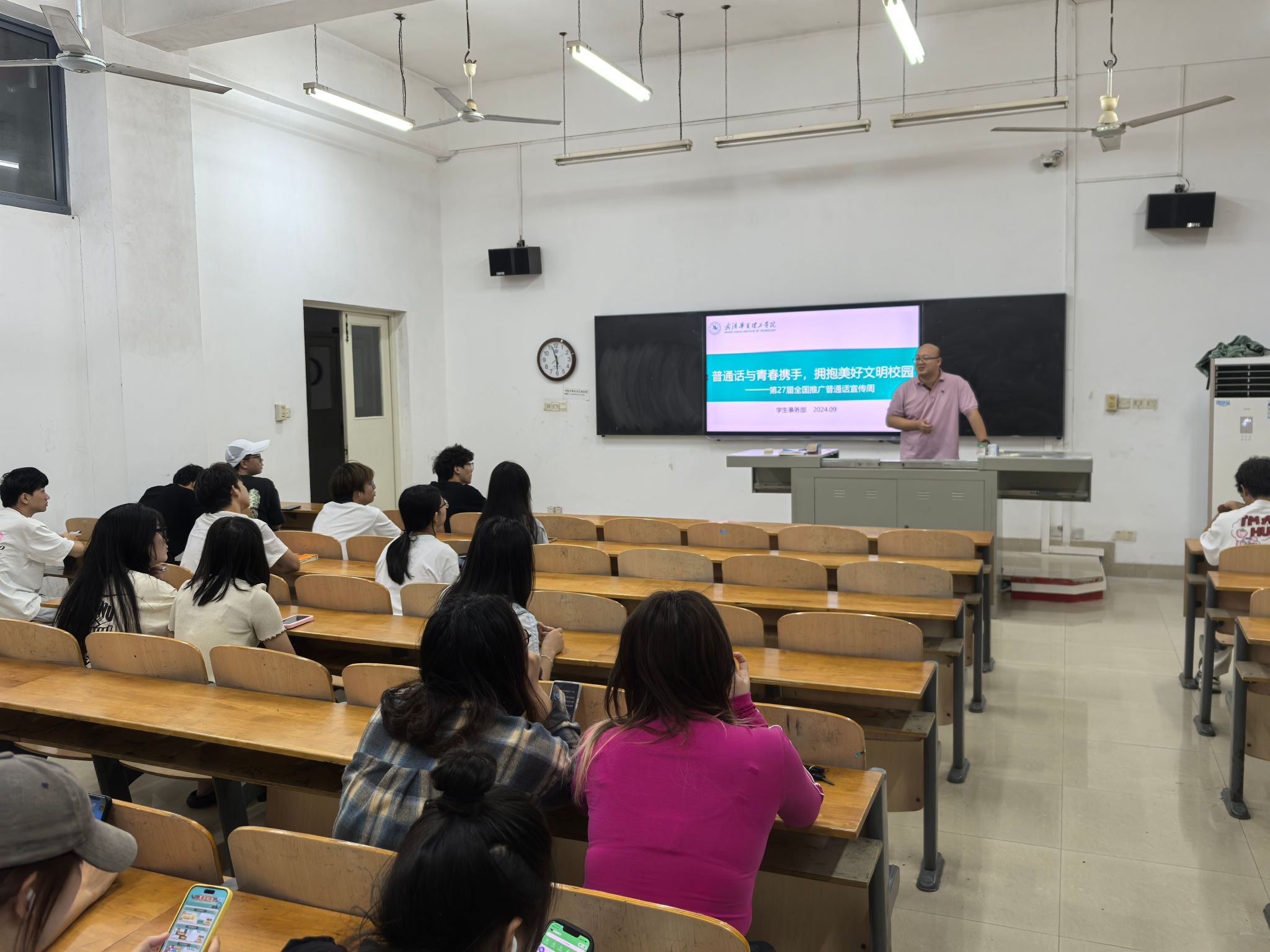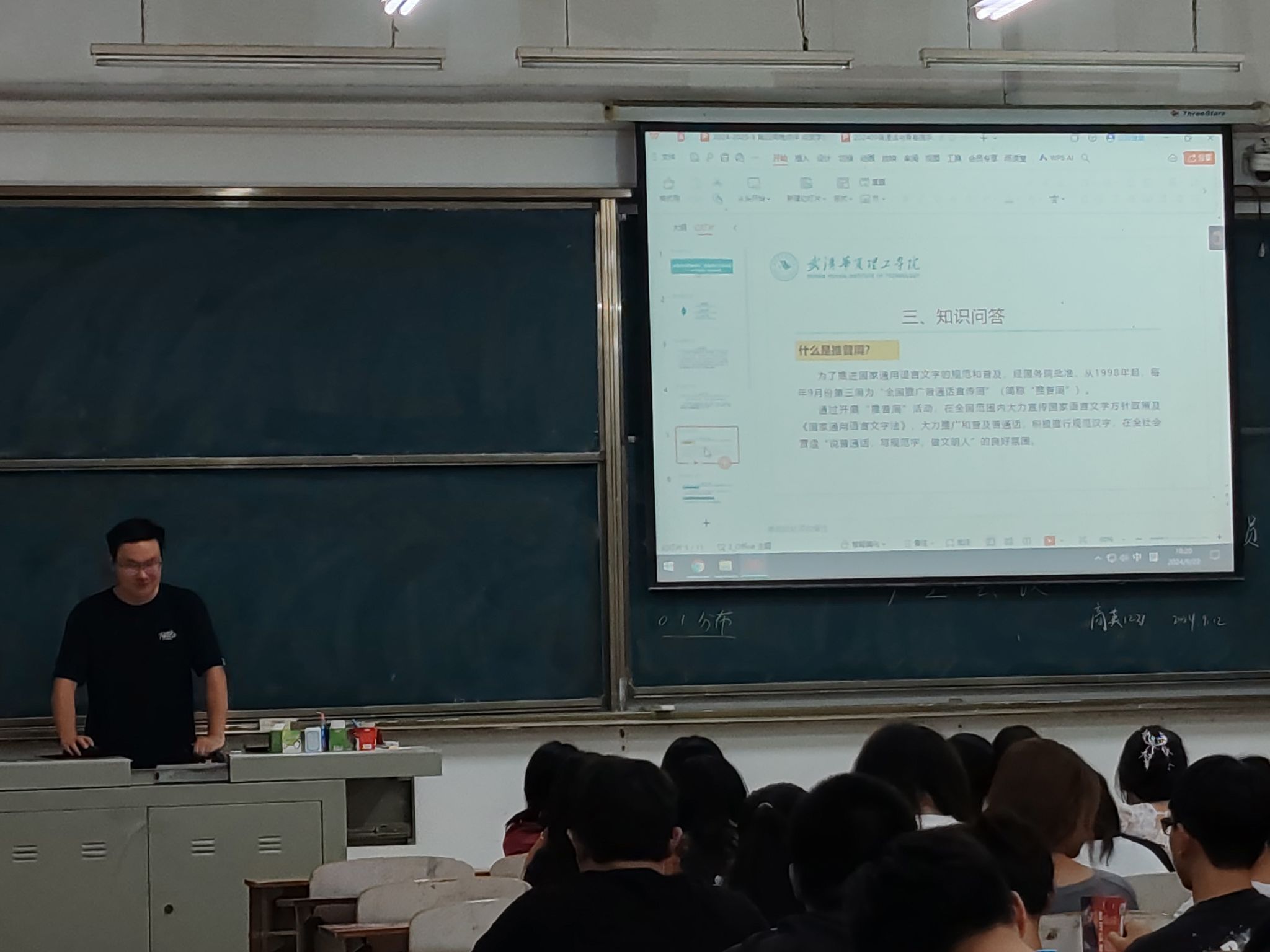 辅导员何啟通过知识问答的形式,帮助同学们学习普通话的相关知识。学工办主任刘浩波表示,2024年是中华人民共和国成立75周年,是实现“十四五”规划目标任务的关键一年,是教育强国建设全面开启的重要一年。同学们要共同努力营造“说普通话,写规范字,做文明人”的良好氛围。