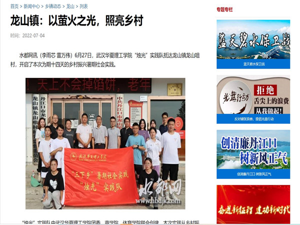 一方净土、两寸粉笔、三尺讲台、数名学生,而万丈光芒。愿为微微萤火之光,点亮前行之路,播撒希望的种子。时隔一年,武汉华夏理工学院暑期社会实践——“烛光”实践队整装再出发。这个暑期,他们带着爱、带着责任,奔赴湖北省十堰市丹江口市龙山镇龙山咀村,用脚步丈量山河,用爱传递温暖。该暑期支教活动深受大众的关注,丹江口水都网对此次活动进行了报道和宣传。