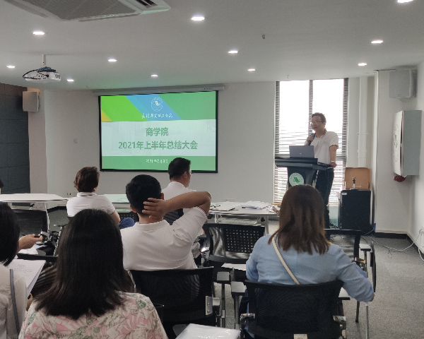 2021年7月8日上午,商学院在综合楼1401会议室召开2021年上半年工作总结大会,会议由商学院党总支书记孙文胜主持,副院长潘连柏、王艳出席会议并发表讲话。