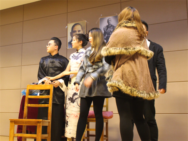 摩登话剧社是一个充满青春正能量、团结有爱的团体,他们的口号是:“舞台即人生,酸甜苦辣,俱在摩登。”演出伊始,摩登话剧社社长黄有维简洁地介绍了剧目并保留了悬念,引起了观众们的热切期盼。首先上演的是《对不起,打错电话了》,该剧目的男女主角分别是王雯靖饰演的史蒂文森太太和张琛皓饰演的话务员甲、乙、丙以及话务长、达菲警官、护士。在这个剧目中,女主角用丰富的语言、表情及肢体动作,充分地表现出了内心的焦虑不安。而男主角一人扮演多个角色,但皆鲜明地突出了不同人物的性格特征。张琛皓那精湛的演技无不让观众们惊叹不已、赞叹不绝。此话剧表演结束后,主持人开始互动提问环节,规则是让观众们猜男主角扮演了几个角色,若答对的观众则可获得一个苹果,现场弥漫着激烈的抢答氛围。紧接着上演了《群猴》,它是一出讽刺喜剧,该剧目演员角色分别为金丽纯饰演冯霞造、汪子立饰演孙为本、李龙饰演康公侯、张博文饰演马务实、吕冰洁饰演钱小芳、李畅宇饰演玛瑞以及黄有维饰演警察长。他们每个人的表演都活像一个丑态百出的猴子,将此剧的讽刺意味表现得淋漓尽致。此话剧剧终后,主持人宣布摩登戏剧趴圆满结束。