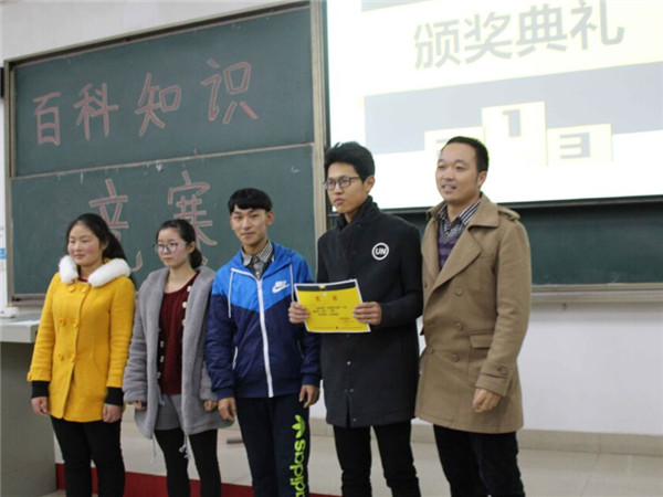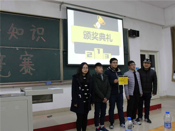 在统计分数的过程中,主持人加设了评委娱乐答题环节,让老师也参加到知识竞赛中与学生同乐,现场呼声最高的李洋老师等人也被一些刁钻的题目所难倒。在片刻的欢愉之后,进入到最后的对获奖团体进行颁奖环节。学工办主任马勇为取得第一名的会计1163颁奖,党总支秘书徐双立为获得第二名的营销1161、经融1163颁奖,团总支书记李洋为物流1161、国贸1162颁奖。