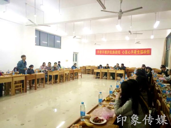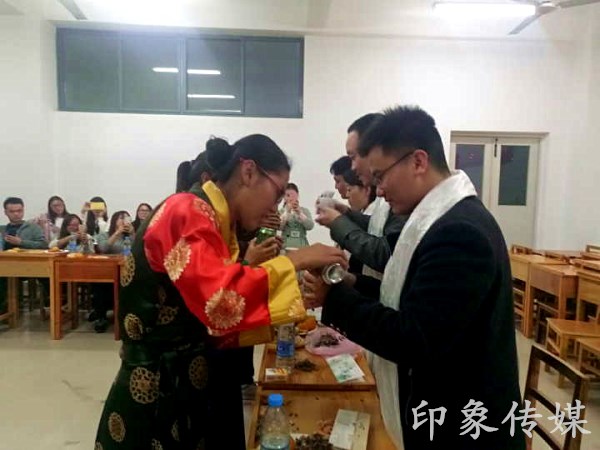 马勇主任首先代表发言,他介绍商学院2016年共招有72名少数民族的学生,提出商学院老师们应该和少数民族的同学们多多交流,给予少数民族同学们更多的关怀的建议,并希望到场的少数民族同学不要拘谨,大方与老师和其他同学们交流分享经验表达。其中一位13级的少数民族学长是在即将毕业的忙碌中,特地抽时间赶过来参加此次座谈会。而后,主持人组织同学们进行短暂自我介绍,来自不同民族的同学们纷纷为大家介绍了自己,现场气氛瞬间高涨,大家一起鼓掌一起大笑。各位同学围绕自身民族、特色文化、特色景色、特色食品等方面,一起交流感情,一起认识新朋友。会上,来自恩施土家族的同学们居多,其中来自藏族和回族以及侗族的同学们引起了特别关注,自我介绍环节在所有人的开怀大笑中结束。紧接着,各个少数民族的代表纷纷上台和大家分享交流经验。来自营销1161班的藏族代表洛桑次仁同学首先表达了自己对这次活动的感谢,然后他和大家分享了他的成长经历,讲述了自己的一些经历和进入大学的一些不适应,同时,他很感谢室友和老师们的照顾关心,表示他已经融入到班集体中。其中来自土家族的两位同学为大家表演了具有民族特色的摆手舞,和着现场的音乐,大家都很是享受。来自藏族的四位同学则带来了一首祝酒歌,并为到场的四位老师献上了哈达,斟上一杯酒,送了用藏语写的感谢信。