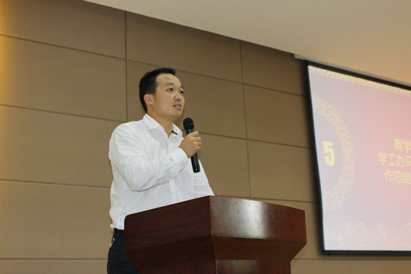视频观看完毕,主持人介绍到场嘉宾,我院团总支副书记马江伟老师宣读学生会干部任职名单。接着,团总支学生会指导老师金亮派发干部工作证,学生会副书记张阳作本学期学生会的工作报告,团总支书记李洋老师对新一学期的学生工作提出相关要求。会议最后,学工办马勇主任作总结性讲话,其中“拼搏到感动自己,努到无能为力”不可谓不精彩。