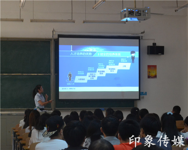 本场招聘会吸引了商学院、机电工程学院和信息工程学院的160多名毕业生,整个会场坐无虚席。招聘会由九州通物流有限公司的人事专员赵女士主持开展。12点30分,赵女士为到场的同学们播放了九州通公司的宣传片,宣传片从承担责任、合作共赢、实现理想等几个方面为同学们详细介绍了九州通公司。随后,公司方从行业概况、企业概况、人才培养、招聘需求等四个方面出发向同学们介绍此次招聘的情况,其中着重介绍了人才培养和招聘需求等方面。紧接着,会议的提问环节开始,有四位同学提出了自己的问题,九州通公司的相关领域负责人一一做出详细解答。最后,九州通公司工作人员宣布了招聘的笔试和面试的时间地点,并为参加第一批笔试的同学们分发了试题及工作意向表。