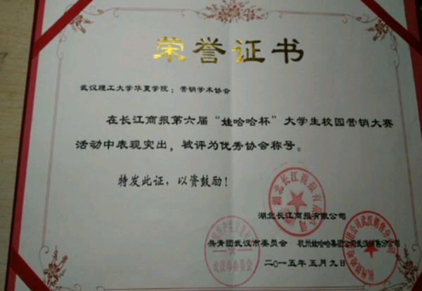 2015年5月,由于该协会在长江商报第六届“哇哈哈杯”大学生校园营销大赛活动中表现突出,被湖北长江商报授予“优秀协会”称号。