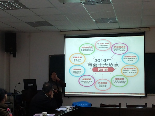 民建会员、武汉理工大学管理学院陈晓慧副教授以2016年两会十大热点做了主题报告。陈教授从“十三五”规划、供给侧改革、脱贫攻坚战、慈善法审议、司法改革、民生改善、创新驱动、绿色环保、拓展空间、政府自身改革等十个方面深入浅出的阐述了相关要点,让人耳目一新。