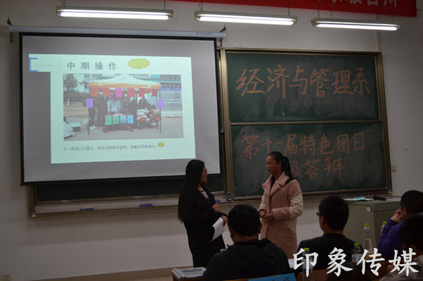 活动伊始,经管系团支书记李洋老师宣布评分标准。紧接着,各团支部依次进行了答辩。此次答辩活动分特色团日,PPT展示和评委提问两个环节。制作精美的PPT浓缩了每个团支部的特色活动,涉及三走赢未来,百善孝为先,弘扬中华传统文化,换寝为家,悦动青春,感恩华夏等广泛内容。优美的解说词,抒情的音乐,趣味十足的DV短片,新颖的宣传海报,别出心裁的展示方式使整个答辩活动精彩纷呈。活动中,掌声不断。展现在观众眼前的事一个又一个团结、热情、积极向上的集体。