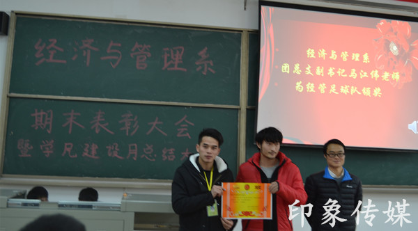 会上,李洋老师对学风建设月进行了总结,并宣读了本次学风建设月优秀班级的获奖名单以及"我要当学霸"活动的获奖名单,其中李洋老师着重表扬了在学风建设上表现优秀的国贸1151班及财管1153班等班级。伴着热烈的掌声和欢快的乐曲声,鲁煜林老师和马江伟老师分别为"我要当学霸"和学风建设中十大优秀班集体代表颁发了奖状。15级国贸专业刘星畅同学作为优秀学风建设班级代表上台发言,阐述了自己对学风建设的看法,并大致介绍了国贸1151班的学分建设状况。随后,杨洋老师宣布了期末表彰获奖名单并为获奖同学颁奖,马江伟老师为我系足球队颁奖,并对此次我系足球队的出色表现提出了表扬。
