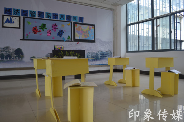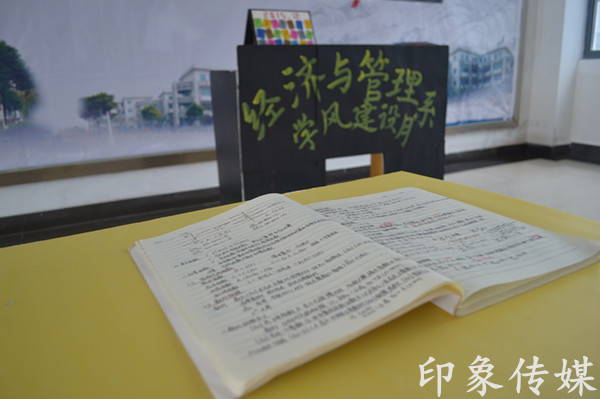 此次展览不但与宣传主题巧妙呼应,其形式更是新颖。它按照教室的模式进行布局,由黑板、讲台、桌椅、书本等学习有关的物件组成。其中最吸引眼球的当属学霸们的笔记与课本。展览的笔记都是由经管学子一笔一划写出“最美见证”,它见证了同学们每一次的成长与进步,更见证着华夏的学风建设。展览中令人感动的不只是整洁有序的笔记,还有这次展览用到的桌椅道具。而这些桌椅道具都是由同学们自己手工制作而成,其中的真情,溢于言表。随着展览的进行,同学们对展览的好评不断,同时此次活动也得到了老师的认可。