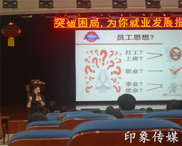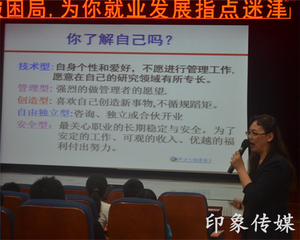 同时,针对“企业需要什么样的人才:我的未来谁做主?”这一话题,余老师分享了自己的看法,她从企业需求什么样的人才角度出发,提出“勇于负责,明确目标,保持积极的态度,制定自我发展计划”是当今企业需要的人才,也从职业性格测试的角度让同学们了解到自己所适合的企业和职业。