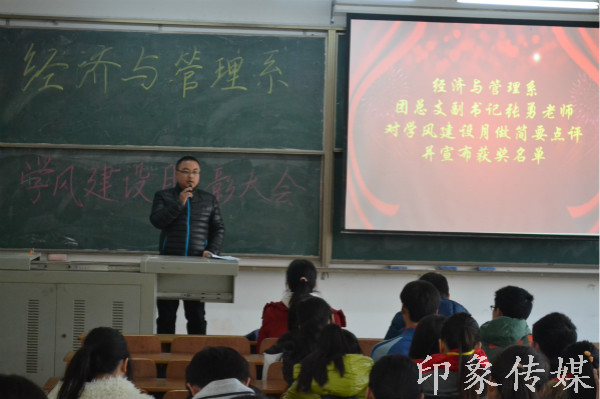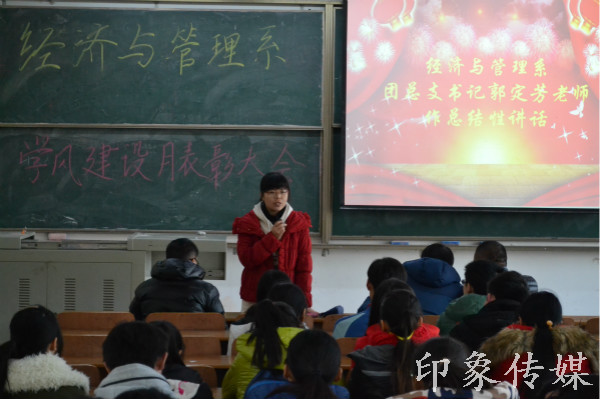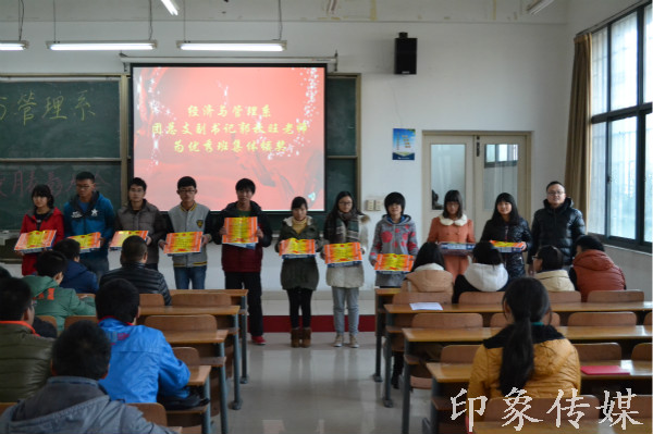 2014年12月24日12:10我系在1-101召开了经济与管理系学风建设表彰大会。出席本次会议的有经济与管理系团总支书记郭定芳老师、副书记郭秋旺老师、副书记张勇老师、各班级辅导员以及获奖班级里的同学。