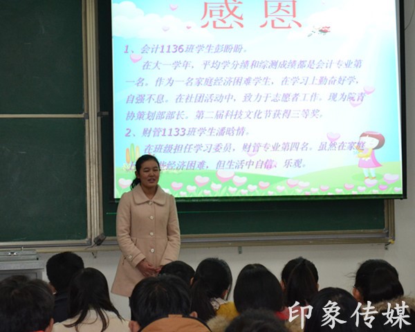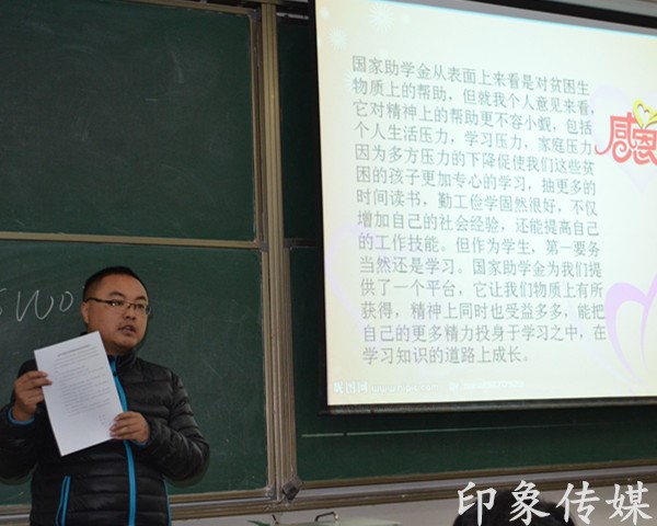 在一片热烈的掌声中,大会拉开了帷幕。大会伊始,李洋老师为同学们讲解了获得国家助学金的条件和要求。紧接着,三位获得助学金的13级学子向14级获得助学金的学弟学妹们分享了获得助学奖金后的感言。同学们从精彩纷呈的讲解中学到了搞好学习和为人处世的方法。相信他们在以后的日子里也会不断超越自己,努力学习,感恩社会,回馈社会。最后,张勇老师给学子们寄语:国家助学金不仅是物质上的帮助,更是精神上的鼓励和心灵上的慰藉,希望同学们能够用好这笔带有爱的温度的助学金,安心学习,顺利完成学业,常怀感恩之心,早日回报社会。