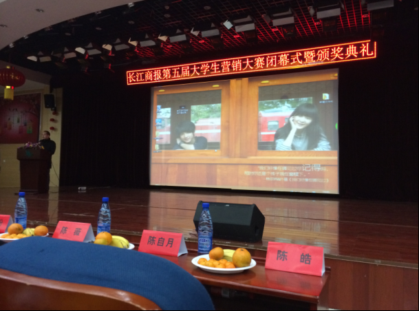 11月15日下午两点,由共青团武汉市委、湖北长江商报社、中国青年网湖北频道联合举办的第五届大学生校园营销大赛闭幕式暨颁奖典礼在我院学术报告厅隆重举行。共青团武汉市委副书记柳新、湖北长江商报社社长蒋经韬、中国青年网湖北频道总编辑李平、我院副院长丁成忠以及杭州娃哈哈、武汉引动科技公司、武汉爱来魔艺术摄影公司等赞助商代表出席闭幕式,武汉大学、华中科技大学等30所高校近500名师生参加闭幕式。