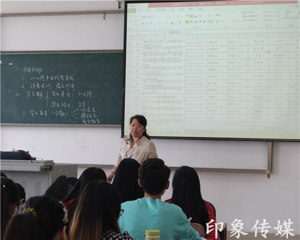 在会上,王艳老师首先对大四学生上下学期的工作进行了系统的说明,帮助同学们合理的划分自己的时间,做到实习、写论文两不误;接着她重点讲解了关于毕业论文的相关问题,并再三叮嘱同学们不要出现毕业论文重题的现象;最后,她给同学们划分了论文导师负责人,并希望同学们能够积极跟自己的导师取得联系,在导师的协助下完成论文的编写。