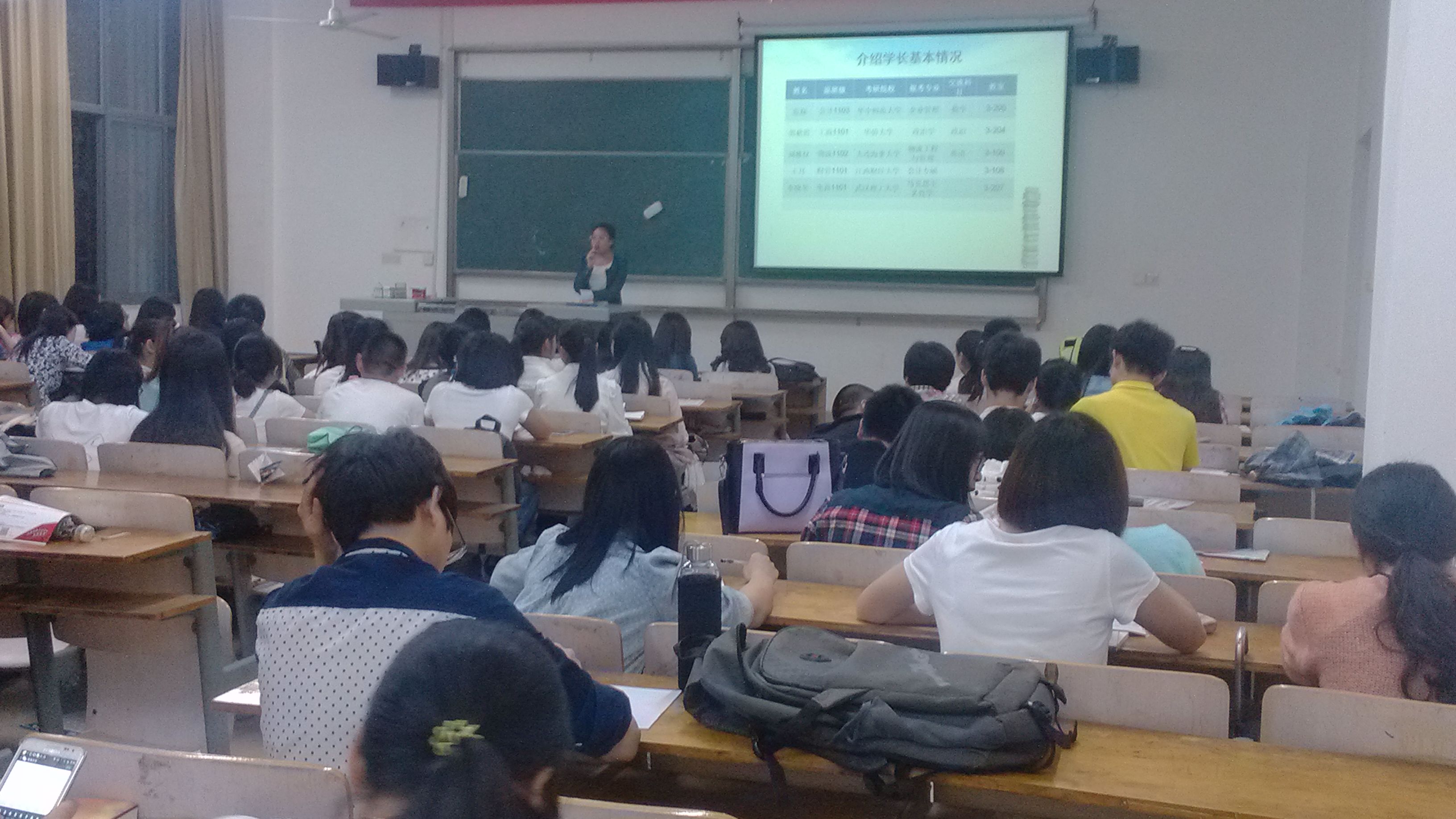 会议尹始,杨俊老师首先向考上研究生的学姐们送去了祝福,并且欢迎他们回母校与学弟学妹交流考研心得。与此同时,杨老师与同学们分享了一些考研信息并给考研同学提出了一些意见及建议。