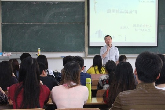 2014年4月3日经管系市场营销专业邀请到周黑鸭公司“合伙人”赫立晓先生来我院进行品牌营销讲座,参会学生涵盖了大一、大二、大三营销和工商专业的学生。赫立晓先生系周黑鸭公司品牌营销负责人,为什么称其为“合伙人”,赫立晓先生说这是周黑鸭公司进行公司内部营销的一种措施,目的是消除传统的职场认知,将公司内部核心成员尤其是骨干成员树立起公司主人的定位,全身心投入到公司的发展过程中。赫立晓先生语言淳朴、幽默、直白,将周黑鸭公司的发展背景、品牌塑造的典型事件和未来品牌形象的树立等与参会学生进行了很好的沟通交流,随着讲座的不断进行,会场的氛围也越加热烈,同学们对周黑鸭这个品牌更加感兴趣,提出了很多宝贵的建议也提出了很多疑问,都得到了一一解答。