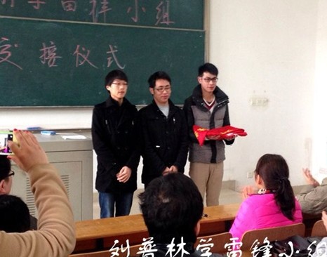 大会由系团总支副书记李玥主持, 11级“刘普林学雷锋小组”成员代表周向伟首先就“刘普林学雷锋小组”在过去的一年中所做的努力和取得成绩谈了几点体会,认为参加“刘普林学雷锋小组”充实了自己的大学生活,磨砺了自己的品格。12级“刘普林学雷锋小组”成员向明民代表12级全体党员接过 “刘普林学雷锋小组”旗帜并发言,对12级“刘普林学雷锋小组”的活动方向做出规划,在接下来的雷锋服务月中不断创新。