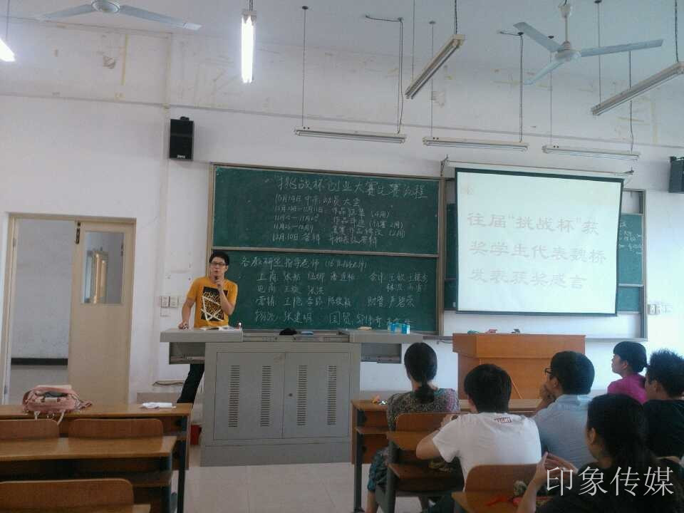大会开始,由往届获奖学生代表营销1101班魏桥发言,他的团队在11年获得了湖北省“挑战杯”创业大赛的金奖,进入国赛,并在全国大学生“挑战杯”创业大赛获得铜奖。他所发言的内容主要分三部分:一是鼓励学弟学妹们积极踊跃参加本届大赛,二是告诉学弟学妹们在比赛中应该注意的参赛事项,三是讲述了比赛带给自己的提高和帮助。
