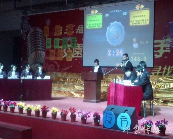 整个现场座无虚席,在观众高涨的热情中比赛拉开了序幕。正方坚持利大于弊,反方坚持弊大于利,双发各执一词,互不退让。双方激烈的言词将比赛推向了高潮,观赛亲友团的响亮口号更是激励着双方队员。最后评分小组打分,经管系以三分的优势赢了机电工程系。