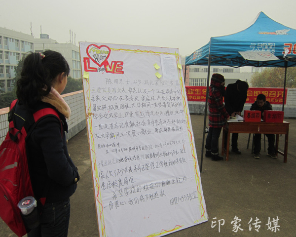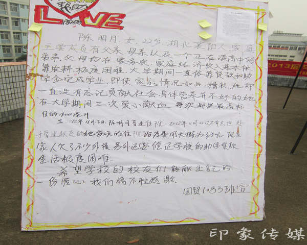 11月22日凌晨,一个年仅22岁的女孩永远的离开了我们,她叫陈明月,来自经管系国贸1083班。9天前,陈明月突然晕倒,住院后一直处于昏迷当中,医生确诊为肝功能衰竭晚期,坚强的她虽然一直凭借着自己的意志与病魔作斗争,但最终还是被无情的夺走了生命。家庭情况十分困难的她在大学期间一直依靠贷款和助学金完成学业,但这并没有让她畏惧贫穷,反而还帮助那些更需要帮助的人,即使自己身体素质不好,也在大学期间献血三次,并且每次都是最高标准的400毫升血液。不幸的遭遇让她的亲人和朋友万分悲痛,巨额的贷款和医疗费用把她的家庭压得喘不过气,关心她的朋友同学们得知此事后举行募捐活动。