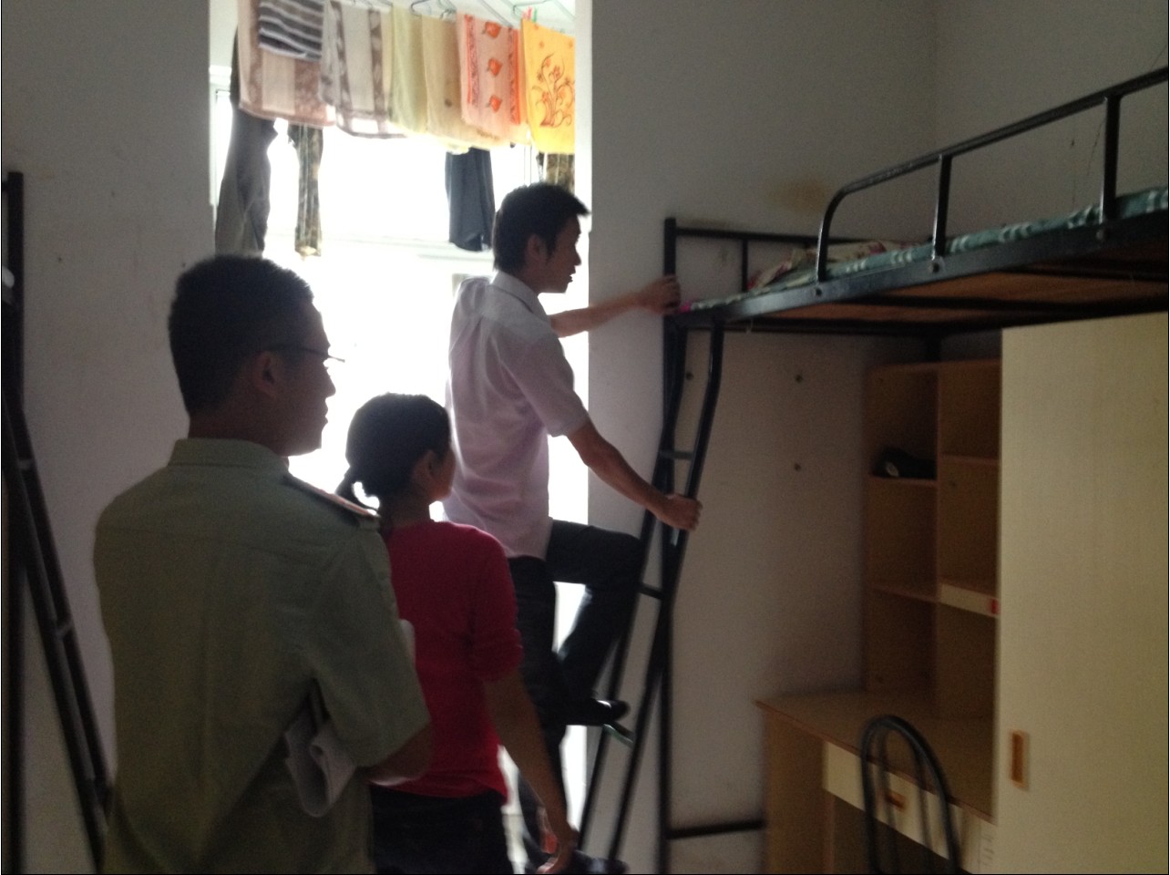 记者跟随张主任一行对7号楼A区6楼进行了走访。抽查的过程中,张平主任和毛峥毅老师以及各位新生辅导员仔细查看了寝室各种设施状况,就具体出现的问题和新生进行了交流,张主任指出要从细节入手,培养良好的个人生活习惯,上好新生入学的第一课。各位新生辅导员也做了详细的记录,并表示会指导新生尽快的适应大学生活和学校的相关规定。