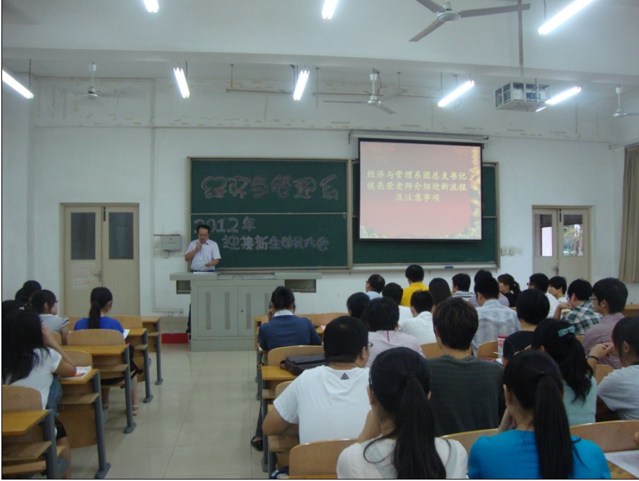 9月6日下午,经济与管理系2012届迎新动员大会在2教201隆重召开。出席本次大会的有经济与管理系党总支书记胡水兵同志,学工办张平主任,党总支秘书毛峥毅老师,团总支书记侯亮荣老师,以及其他辅导员老师参加。大会由何江老师主持。