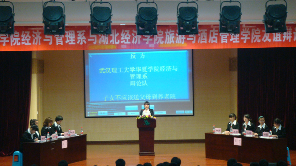 2012年3月30日,由武汉理工大学华夏学院经济与管理系与湖北经济学院旅游与管理学院共同举办的第一届“求是杯”友谊辩论赛在华夏学院新学术报告厅激情上演。华夏学院经济与管理系团总支书记侯亮荣、湖北经济学院旅游与管理学院分团委书记陈瑶及两院部分学生共同观看了这场比赛。