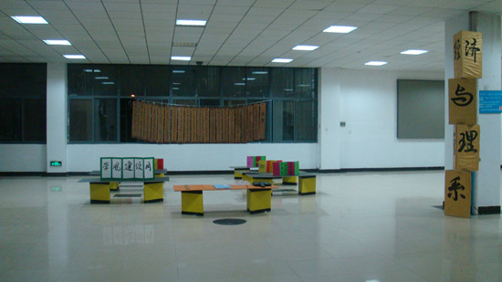 本次宣传阵地由系宣传部全力承办,以古代私塾的布置为原型,运用KT板、卡纸等多种原料精心布置而成,古风意味浓厚。大厅中心摆设了七张私塾课桌,主桌上安置精致的书籍及笔墨纸砚等物,而其余课桌上则摆放了类似书籍的宣传材料,对学风建设月中的演讲比赛、珠算大赛、学风建设月报设计大赛等多项活动进行了宣传。整个场地的布置背景也是此次的亮点之一,正后方悬挂着一卷展开的竹简,上书《为学》,字体刚劲有力,意义绵远悠长。