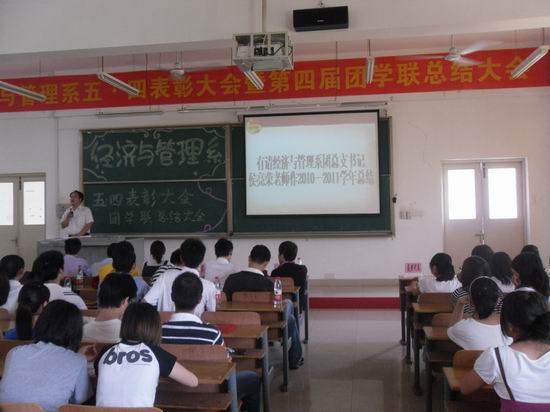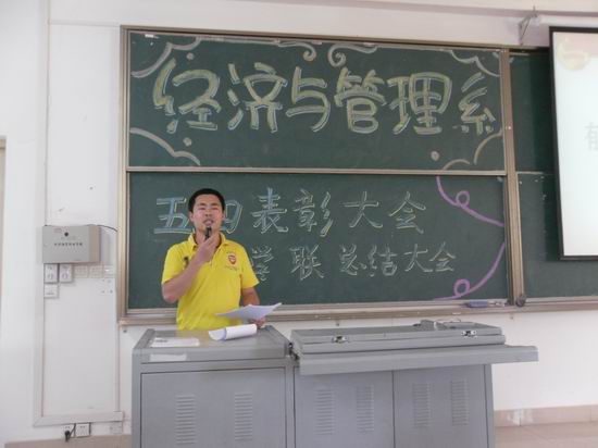 五月的花海,我们用青春拥抱时代,“五·四”的火炬,照亮团学联继往开来的路,六月的激情打开团学联新一页的篇章。6月1日,经济与管理系“五·四”表彰大会暨第四届团学联总结大会在1教201如期举行。系党总支胡水兵书记、党总支秘书毛峥毅老师、学工办张平主任及各老师莅临会场,与团学联学生干部及优秀团干、优秀团员共同见证这光荣的时刻。学生副书记柳玉清担任此次大会主持。