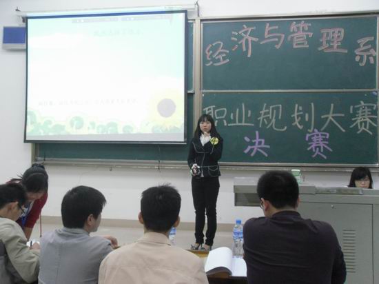 “海阔凭鱼跃”、“我的青春我做主”、“我的城池”等响亮的口号表达了选手对未来职业的主宰希冀,她们展示的PPT中运用图表和文字从自我分析、环境分析、目标设置、实施方案等各个方面规划职业道路。选手大多把从事本专业相关的行业作为第一职业考虑,其中备选调整的其他职业也得到老师的赞许与鼓励,如西部支教、开网店等。答辩环节,评委老师在提出问题的同时,针对每位同学都给出了相应的建议。