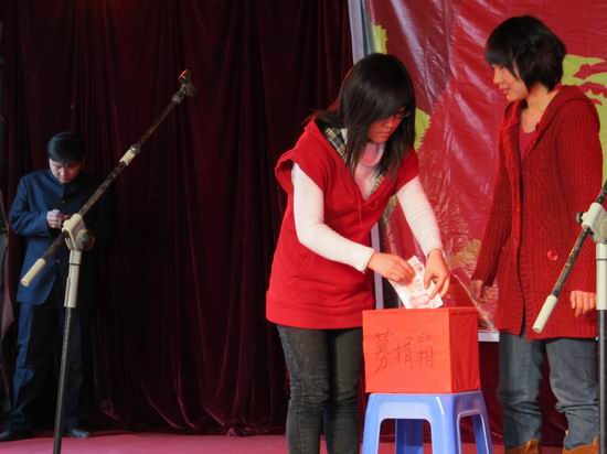 此次义演中,我们也捐出了同学们以阳光义卖形式筹来的善款,金额虽不多,却是我们大家每一个人的祝福,我们真心祝愿盲童们能够快乐幸福!< ◆经济与管理系青年志愿者协会 庞杰>