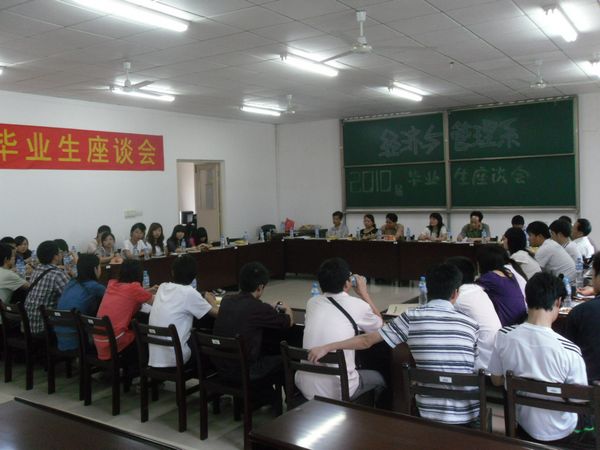 6月12日下午1点在5-302教室召开了经济与管理系2010届毕业生座谈会。系主任程艳霞教授、各教研室主任及系全体辅导员莅临会场,与我系40名毕业生代表进行了亲切交谈。会议由系党总支胡水兵书记主持。