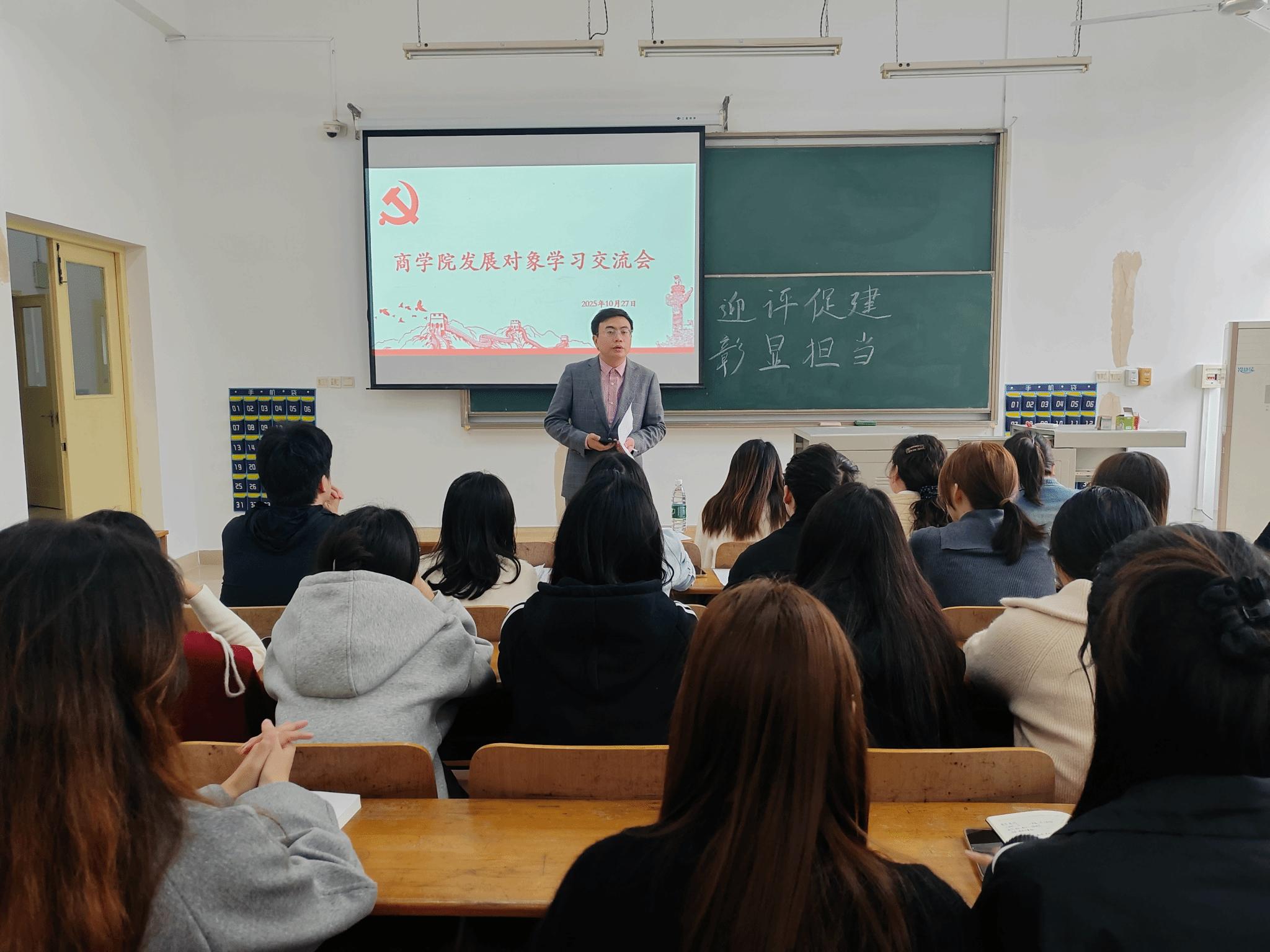 会议伊始,商学院党总支组织员杨洋紧密结合当前“迎评促建”工作大局,深刻阐述了党员发展对象在学校发展关键期的责任与使命。他强调,发展对象要主动对标学校发展要求,积极响应学校部署、配合学校指挥,将理论学习成果深度转化为服务学校建设、服务同学成长的实际行动,在学风建设、校园文化等领域主动亮明身份、带头作出表率,以先锋姿态为学校迎评工作添砖加瓦。
