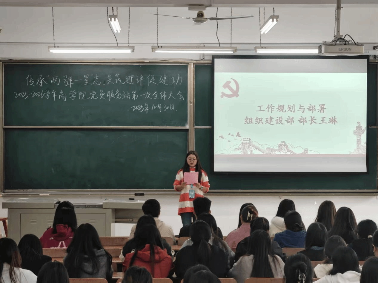 为凝聚党员力量、明确服务方向,助力学校迎评工作,商学院党员服务站于10月30日中午在教学楼1-201召开第一次全体大会。全体成员齐聚一堂,以“传承‘两弹一星’精神”为思想引领,围绕“迎评促建”核心任务,共同描绘服务站的工作蓝图。党总支组织员杨洋,党员服务站全体党员同志参加会议,会议由党员服务站站长叶晓诗主持。