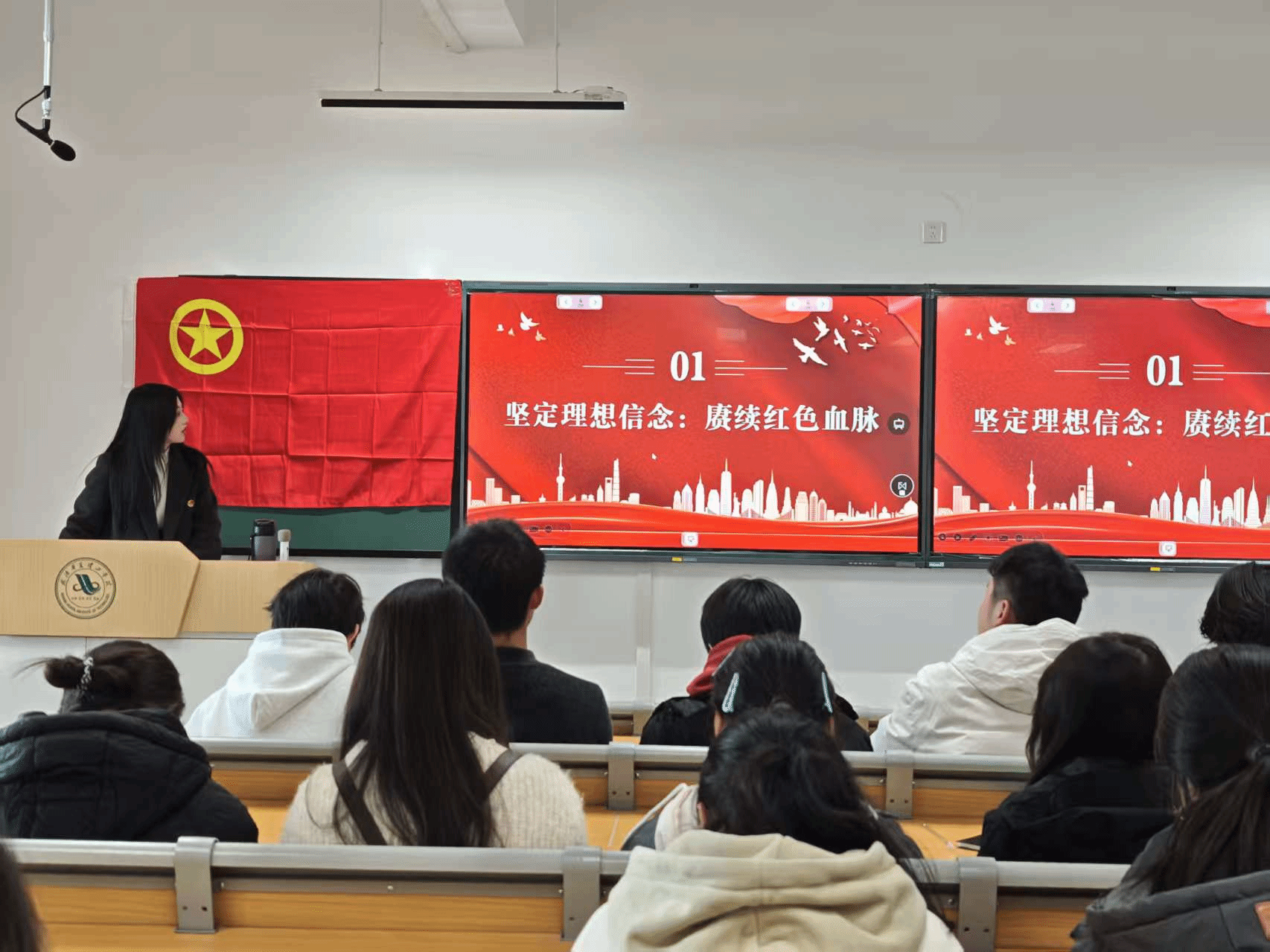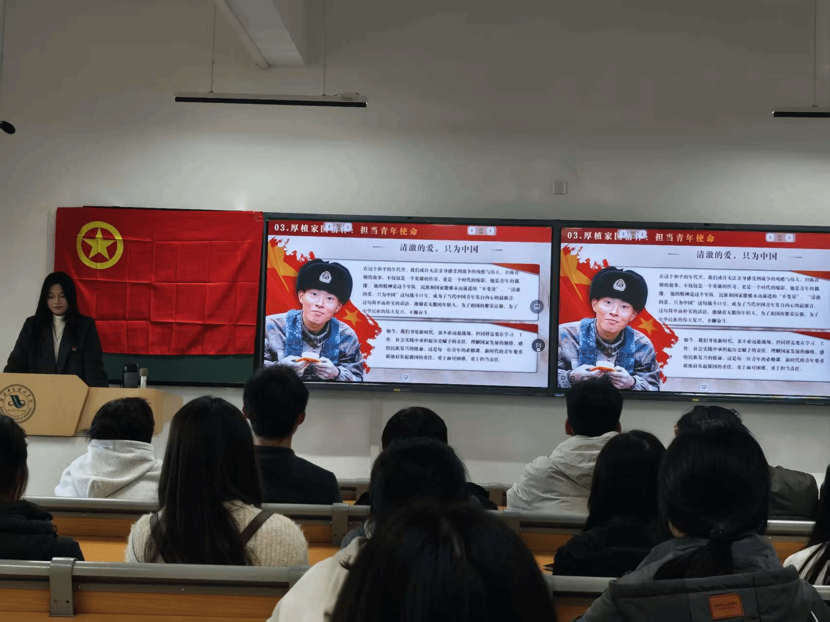 本次主题团日活动围绕“坚定理想信念”“书写青春梦想”“厚植家国情怀”“青春献礼祖国”等多个环节展开,带领同学们重温峥嵘岁月,感悟家国情怀的力量。团支书李意同学以“坚定理想信念,赓续红色血脉”为主题,从革命先辈抛头颅、洒热血的英勇事迹,讲到新时代青年在疫情防控、戍守边疆、科技攻关等领域的担当奉献,生动阐释了“家国情怀”的时代内涵与现实意义,并呼吁大家:“爱国不是一句口号,而是融入血脉的自觉行动。新时代青年要将个人理想融入国家发展伟业,在平凡中书写不凡。”