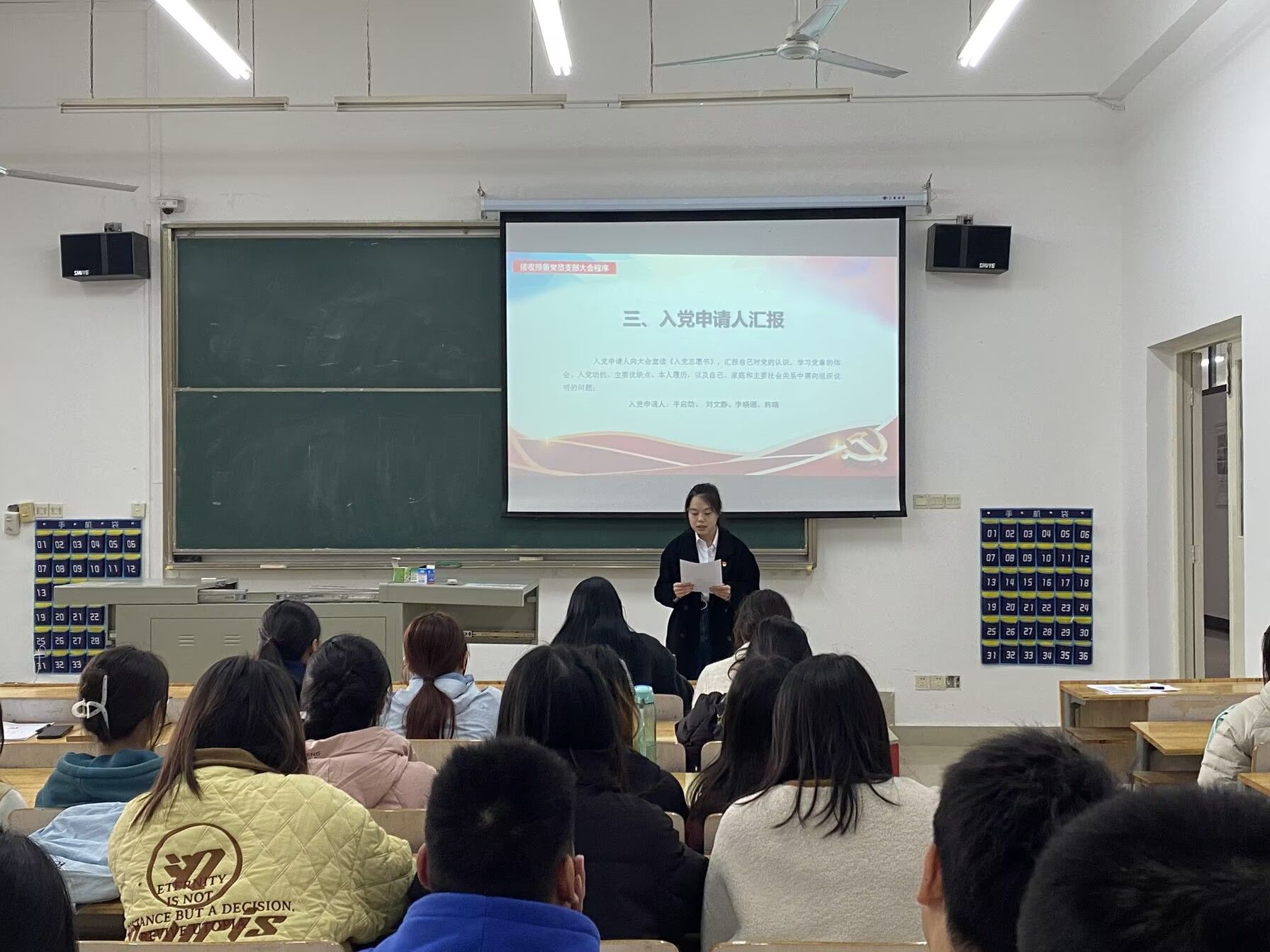 会议伊始,周佩文书记清点并报告到会党员人数,确认会议有效性后庄严宣布会议议题。会议上,平启劼、刘文静、李晓珊、韩晴4名发展对象依次上台宣读《入党志愿书》,从思想进步、学业表现、社会实践、群众关系等方面向党组织作全面汇报,态度诚恳,表达了坚定跟党走的决心。