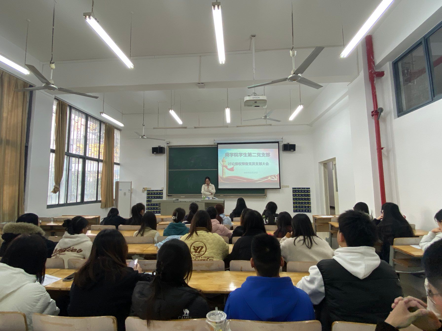2025年11月27日中午12时15分,商学院学生第二党支部于3教103教室召开接收预备党员支部大会。会议由党支部书记周佩文同志主持,支部全体党员出席,严格按照组织程序对入党申请人进行审查评议。