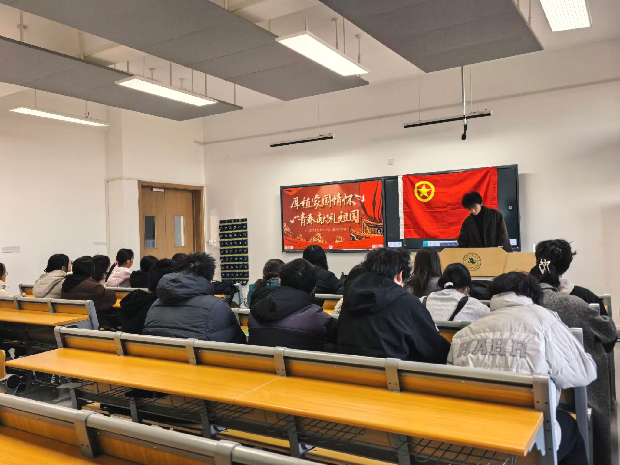 为引导青年深刻感悟家国情怀的时代内涵,以青春之力为中华民族伟大复兴贡献力量,2025年11月27日,武汉华夏理工学院商学院电商1252团支部于梧桐湖校区C207教室开展“厚植家国情怀,青春献礼祖国”主题团日活动。本次活动由学习委员胡明赫主持,支部全体成员积极参与,共同接受了一场内容丰富、形式生动的爱国主义教育。