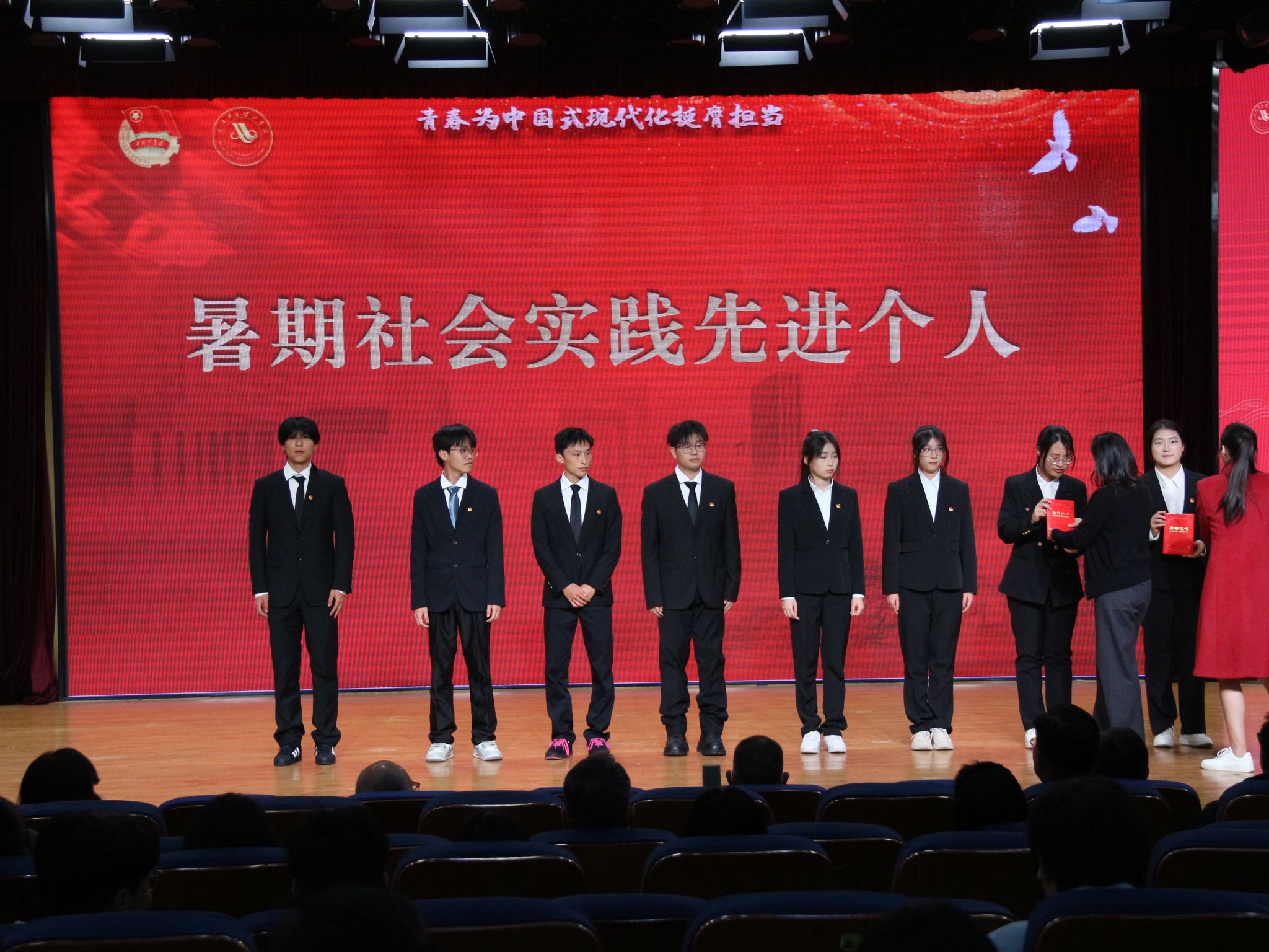 在表彰环节中,商学院“瑶光乡村振兴服务队”凭借其在乡村产业发展、文化振兴等方面的扎实工作和创新实践,荣获“校级优秀实践队”称号。商学院数字经济管理协会指导老师何啟,因在实践项目策划、过程指导与成果转化中的突出贡献,荣获“优秀指导老师”称号。同时,商学院范晨毓、梅欣如等49名同学因在实践活动中组织有力、表现突出,被授予“校级优秀社会实践先进个人”荣誉称号。他们或在支教课堂上倾情奉献,或在调研途中步履不停,或在服务岗位上默默坚守,用青春热情和实际行动诠释了“奉献、友爱、互助、进步”的志愿精神。