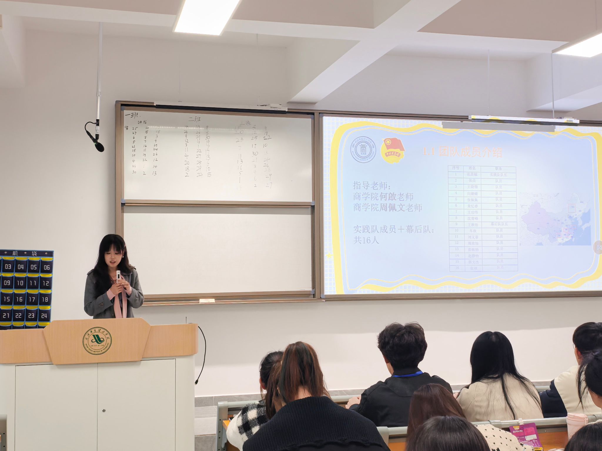 课程伊始,商学院组织部部长何雅文围绕“社会实践的意义,寒暑期社会实践不同类别,社会实践登记表的填写要求”三大板块展开详细讲解。她通过分层拆解的方式,对“三下乡”和“返家乡”两类重点社会实践活动进行了全方位解读,既明确了社会实践的具体种类,也清晰阐明课外社会实践对当代大学生的重要意义;同时,她还针对社会实践材料的格式规范和认定流程进行了细致解读,提前理清了材料准备的“标准清单”,进一步明晰材料填写规范,减少后续材料认定等问题。随后,瑶光乡村振兴实践队队长范晨毓分享了暑期在江陵县白马寺镇的实践经历:实践队落地爱心托管、产业调研、红色传承等系列活动,运用工商知识设计推广方案,电商知识直播带货,数管知识分析产业数据等发挥自身优势破解实践中的现实难题。不仅如此,她还项目的前期对接、中期执行到后期总结三个环节,具体讲解社会实践的实操方法,为社会实践梳理更清晰的路径流程,号召大家积极主动投身社会实践,在服务社会的过程中锤炼本领、增长才干,以实际行动践行新时代团员的责任与担当。