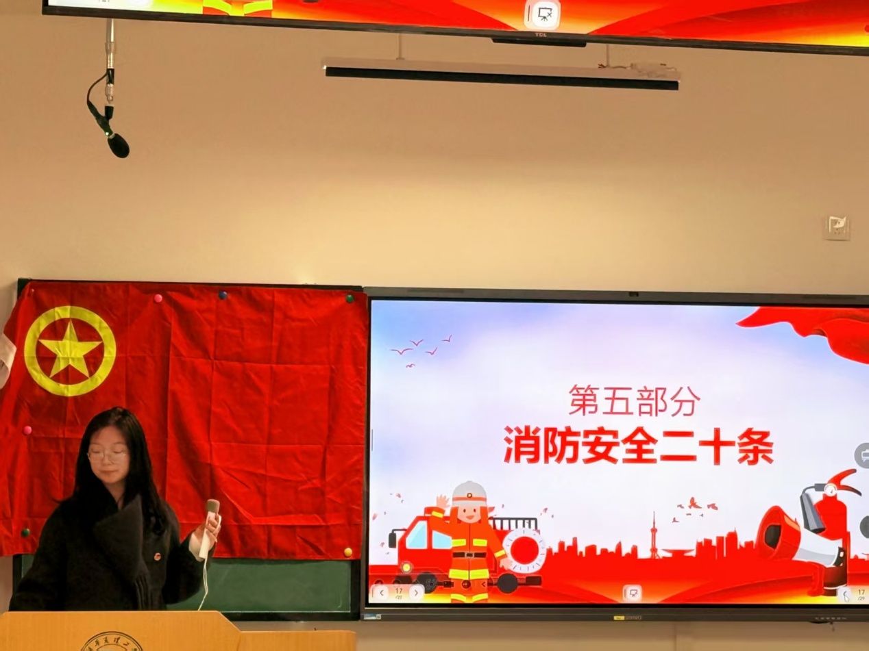 宣讲中,团支书以“身边的消防隐患”为核心,结合国内近期典型火灾案例,用图文结合的方式,直观剖析家庭及校园场景中的消防风险——从宿舍违规用电、易燃物品存放,到公共场所疏散通道堵塞等常见问题,让同学们清晰认识火灾事故的成因与危害。同时,重点讲解“一懂三会”消防核心要点,明确“懂场所火灾危险性,会报警、会灭火、会疏散逃生”的基本要求,并强调《消防安全责任制实施办法》中公民的消防责任,引导大家树立“消防无小事,人人皆有责”的意识。