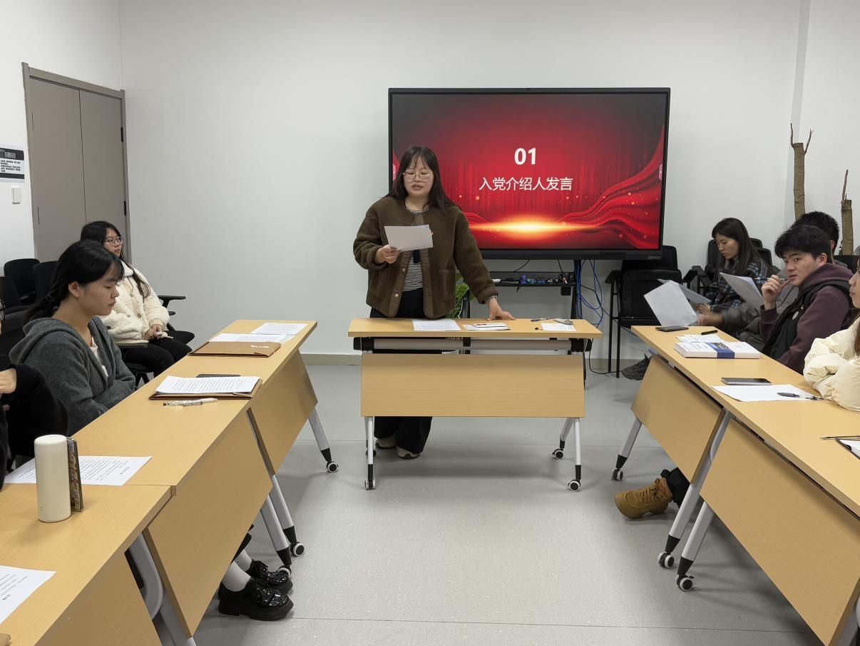洪茹燕同志发言结束后,其入党介绍人张文昌老师和高颖老师先后上台发言。张文昌老师从思想觉悟、工作表现、群众基础等多个方面,对洪茹燕同志预备期间的表现给予了高度评价。高颖老师则结合日常接触,补充介绍了洪茹燕同志的优秀品质,群众口碑良好,一致同意其按期转正。
