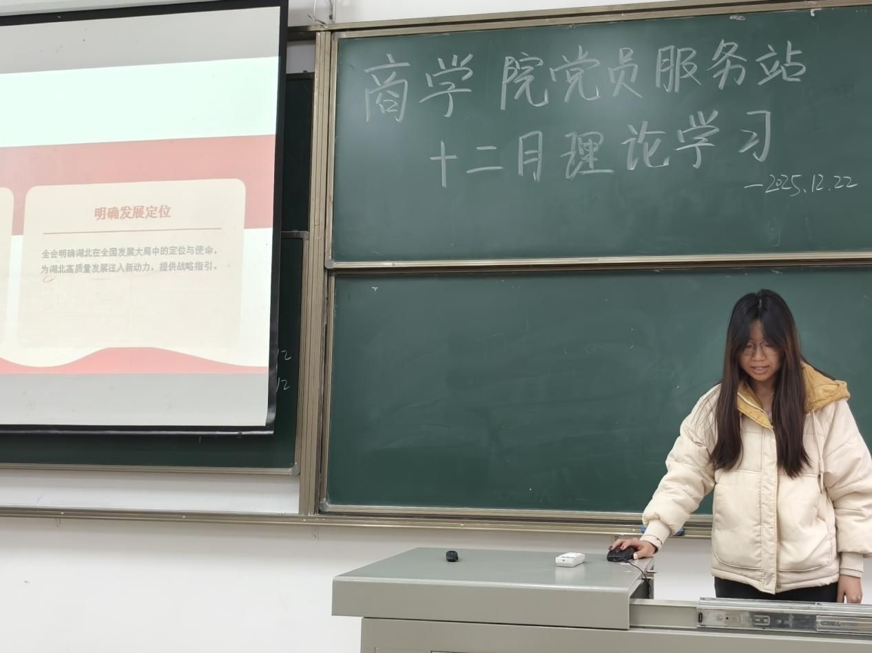 2025年12月22日12:10,商学院党员服务站于2-106教室召开“省委十二届十一次全会精神”专题理论学习活动。以“省委十二届十一次全会精神”为主题,党员服务站的在校党员与成员踊跃参与此次学习,在学思践悟中统一思想,汇聚起砥砺奋进的强大动力。