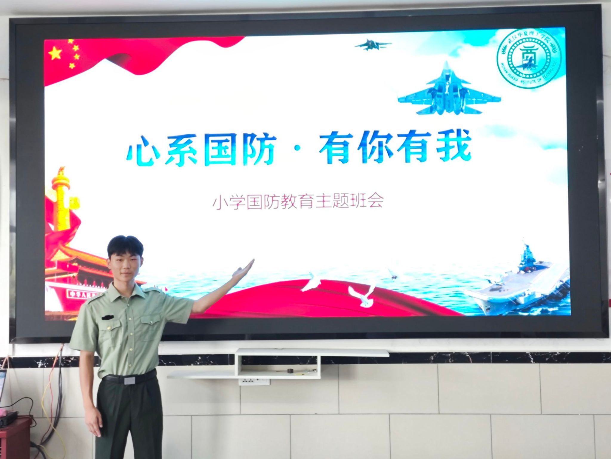 “国防就是国家为了防备和抵抗侵略,制止武装颠覆和分裂,保卫国家主权统一、领土完整、安全和发展利益所进行的军事活动。”武汉华夏理工学院退伍军人志愿者郑家骏向孩子们介绍道。他以问答制的方式通过图片、视频、文字相结合的讲解形式为孩子们提供了国土知识教育、军种知识教育以及现代国防建设教育,带领孩子们初步了解了我国的国土范围、军事种类以及现代军事武器。” 通过了解国家的历史、地理和国防建设成就,使他们深刻认识到国家的发展和稳定来之不易,从而增强对国家的认同感和归属感。
