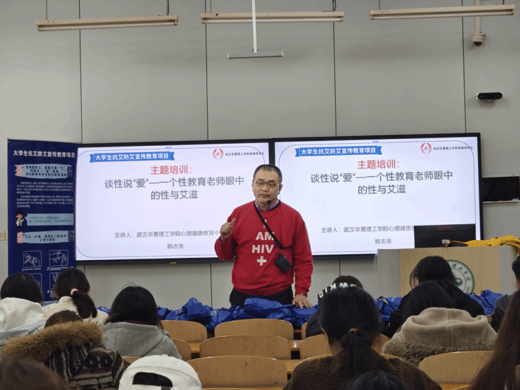 2025年12月2日晚,武汉华夏理工学院抗艾防艾同伴教育骨干培训主题宣讲活动顺利举行。活动邀请到湖北省婚姻研究会性教育委员会主任、武汉华夏理工学院心理健康教育中心主任韩志来带来主题培训《谈性说‘爱’——一个性教育老师眼中的性与艾滋》,参加活动的有校心语心理健康协会青春同伴社、商学院心理健康协会、同伴教育项目团队的学生骨干。